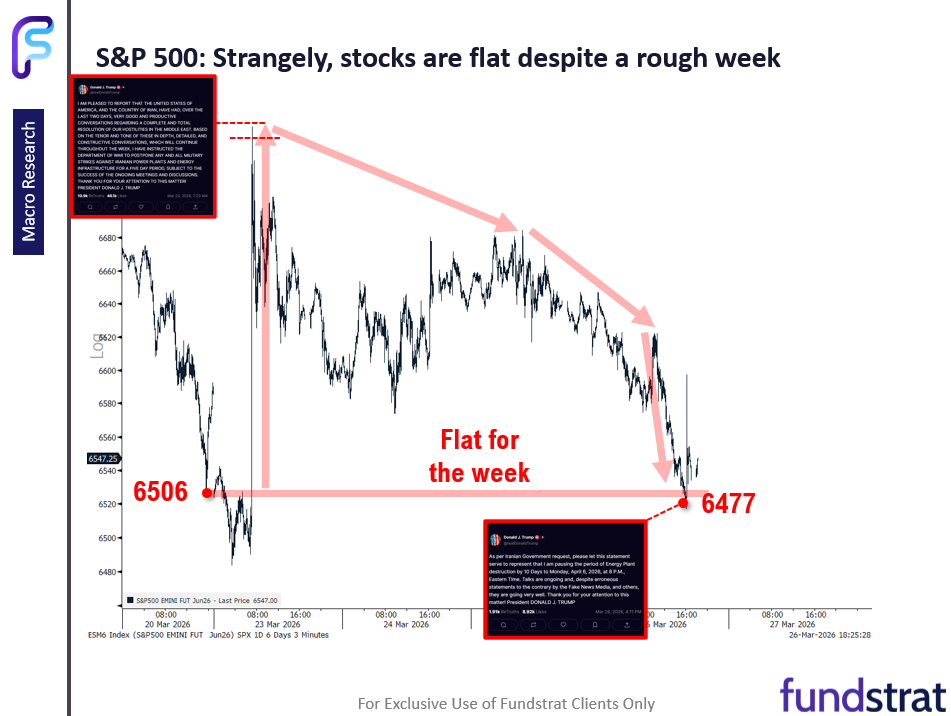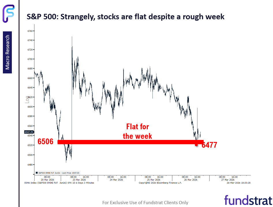- The S&P 500 was 6,505 last Friday (3/20) and closed Thursday (3/26) at 6,477. While there was a lot of movement during the week, we are tracking flat. If equities did not sell off today (Thu), equities would have been up for the week.