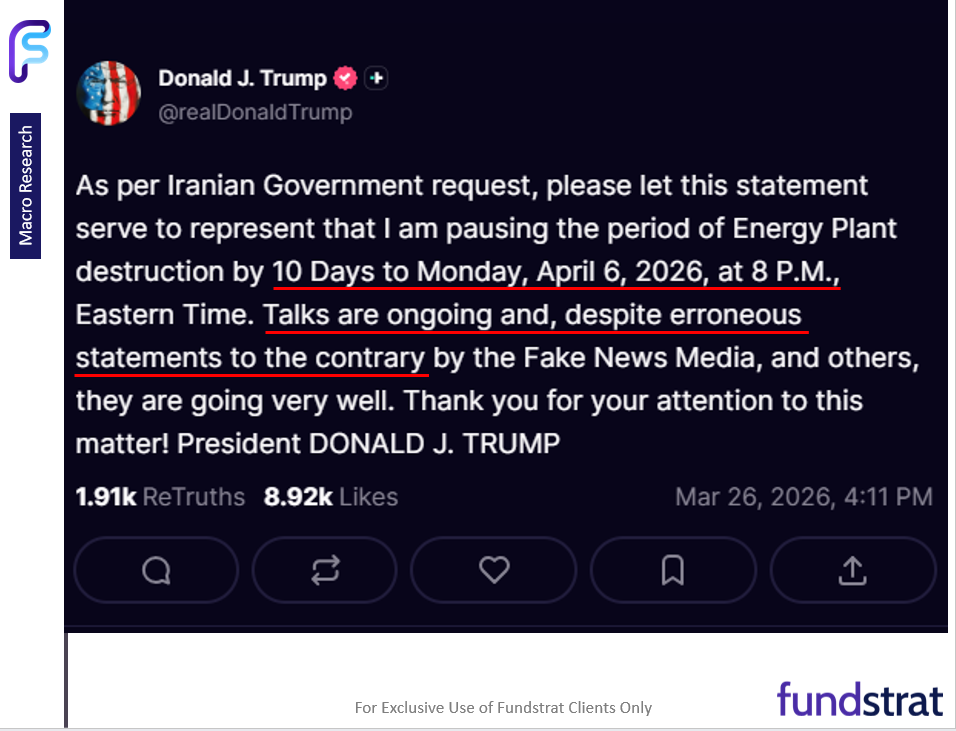 - After the close Thursday, President Trump tweeted on Truthsocial.com that he is further authorizing a pause on attacks of Iran infrastructure until April 6th, 8pm (Monday). And the ostensible reason for this further 10-day delay is progress on talks.