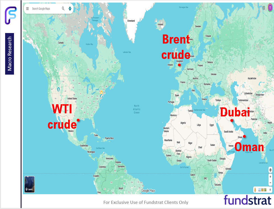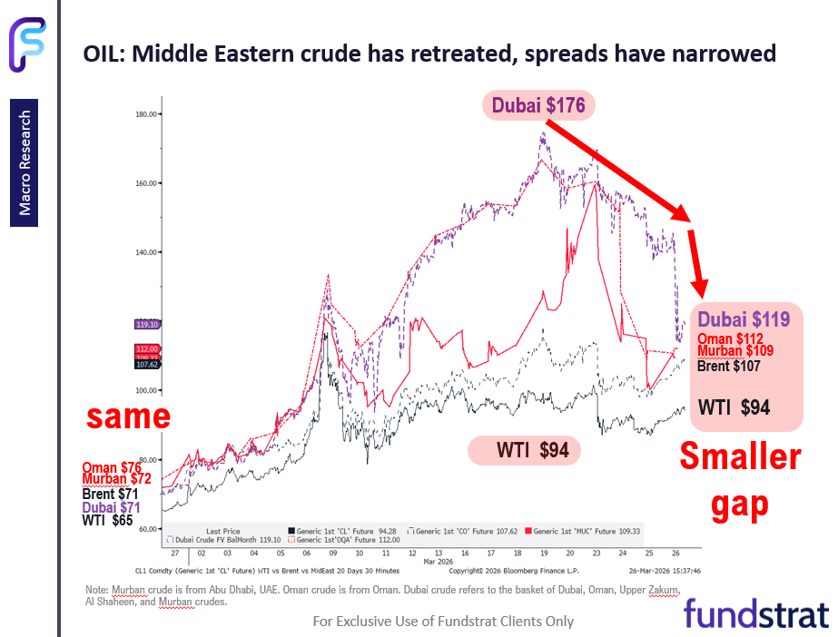 – second, Energy, Crypto and US tech continue to lead. - Regarding oil prices, US consumers generally care about WTI and Europe Brent. And there are Middle East prices. Prior to the war, these prices were relatively close: