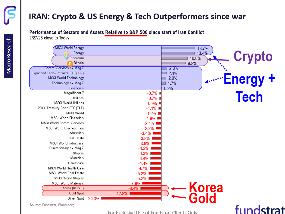 Video: The fog of war continues. But we are seeing some curious developments. First is the shrinkage of oil premiums of the Middle East. Second, is the continued leadership of Energy, Crypto and US Technology.
