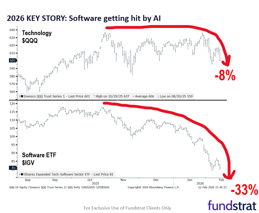 We realize it feels like a bear market out there because the story of ‘software eating the world’ (1980-2025) has now become one of AI eating software. This, coupled with rotations from Armies (Mag7) to Bulletmakers (semis, etc.), feels turbulent. To us, this is all an argument that AI is creating productivity and is disinflationary.