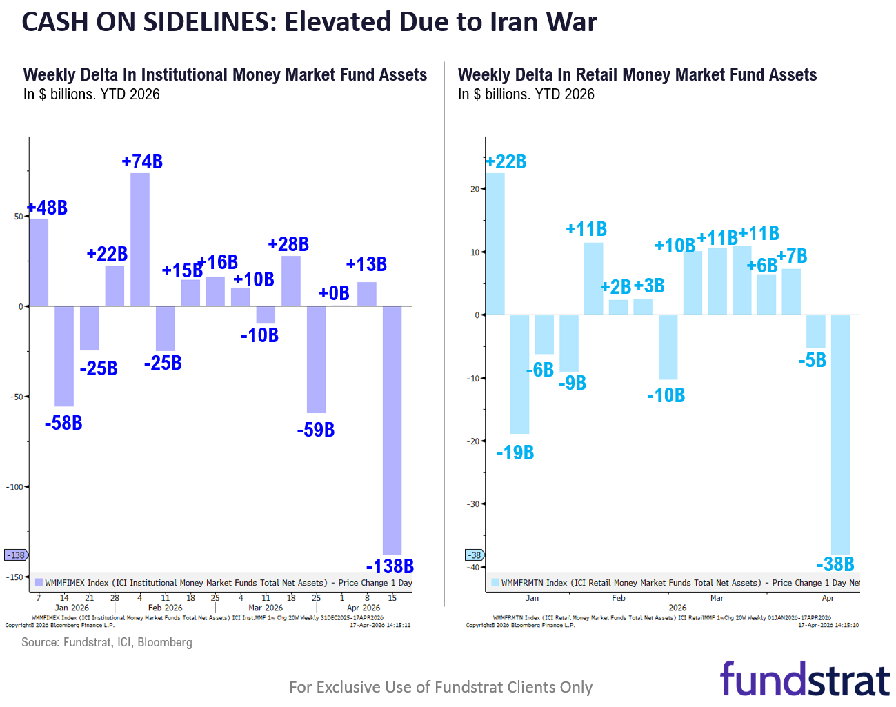 Fundstrat Head of Research Tom Lee believes that the stock market has more room to run in the near term, despite confusion about the war. One big reason is that retail investors didn’t buy the dip as aggressively as hedge funds and other institutional investors. Money market data show that retail raised cash as markets were bottoming, a complete reversal from last year’s Liberation Day when retail pounced in, while institutional investors waited on the sidelines, as our Chart of the Week shows. Lee believes retail coming in now will be “fuel for the continued upside.”