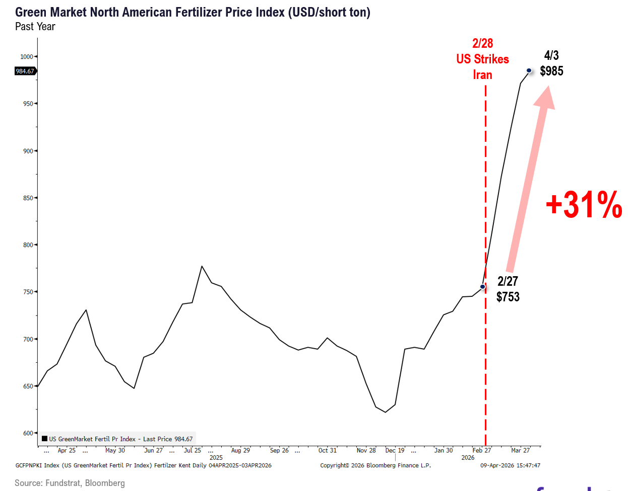 There’s also the fertilizer, and the most timely illustration of how that works is the recent war in Iran. Fertilizer, much of which is either shipped through the Strait of Hormuz or made from natural-gas feedstocks that use the same route, has gotten significantly more expensive since the Iran war began. (To be fair, the spike in fertilizer prices was more extreme after Russia’s 2022 invasion of Ukraine.)